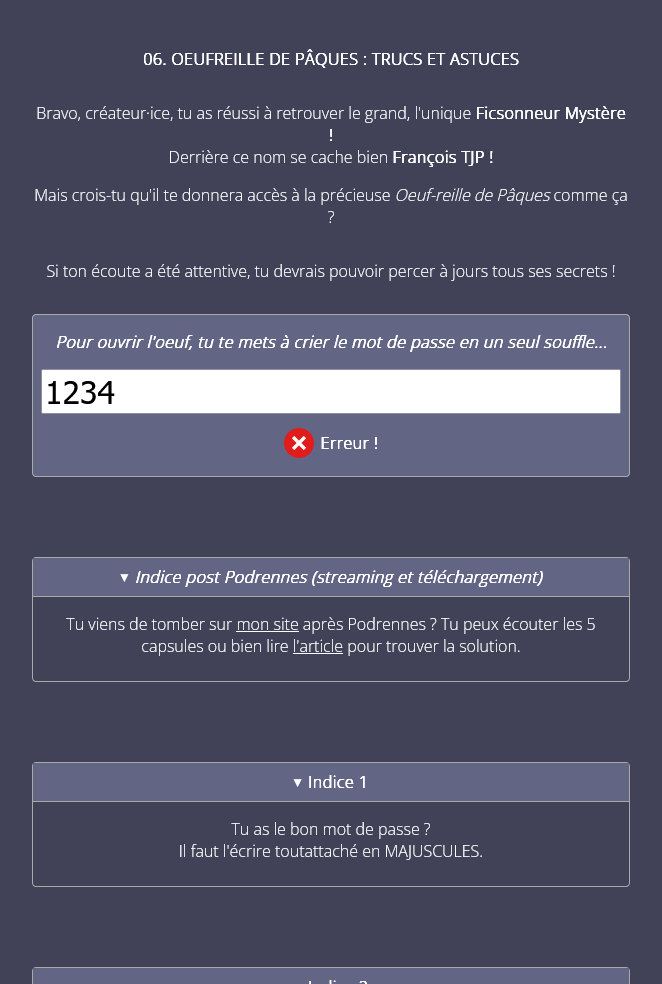 Mais c’est en fait à double titre que j’ai contribué à cette activité, car j’ai aussi codé la page web permettant d’accéder à la fameuse capsule, lors du festival. Cette page web devait avoir un champs de mot de passe, et dévoiler la récompense (l’épisode) en cas de succès. C’était assez fun à faire, j’ai même rajouté des animations de confettis quand on réussit. 🎉